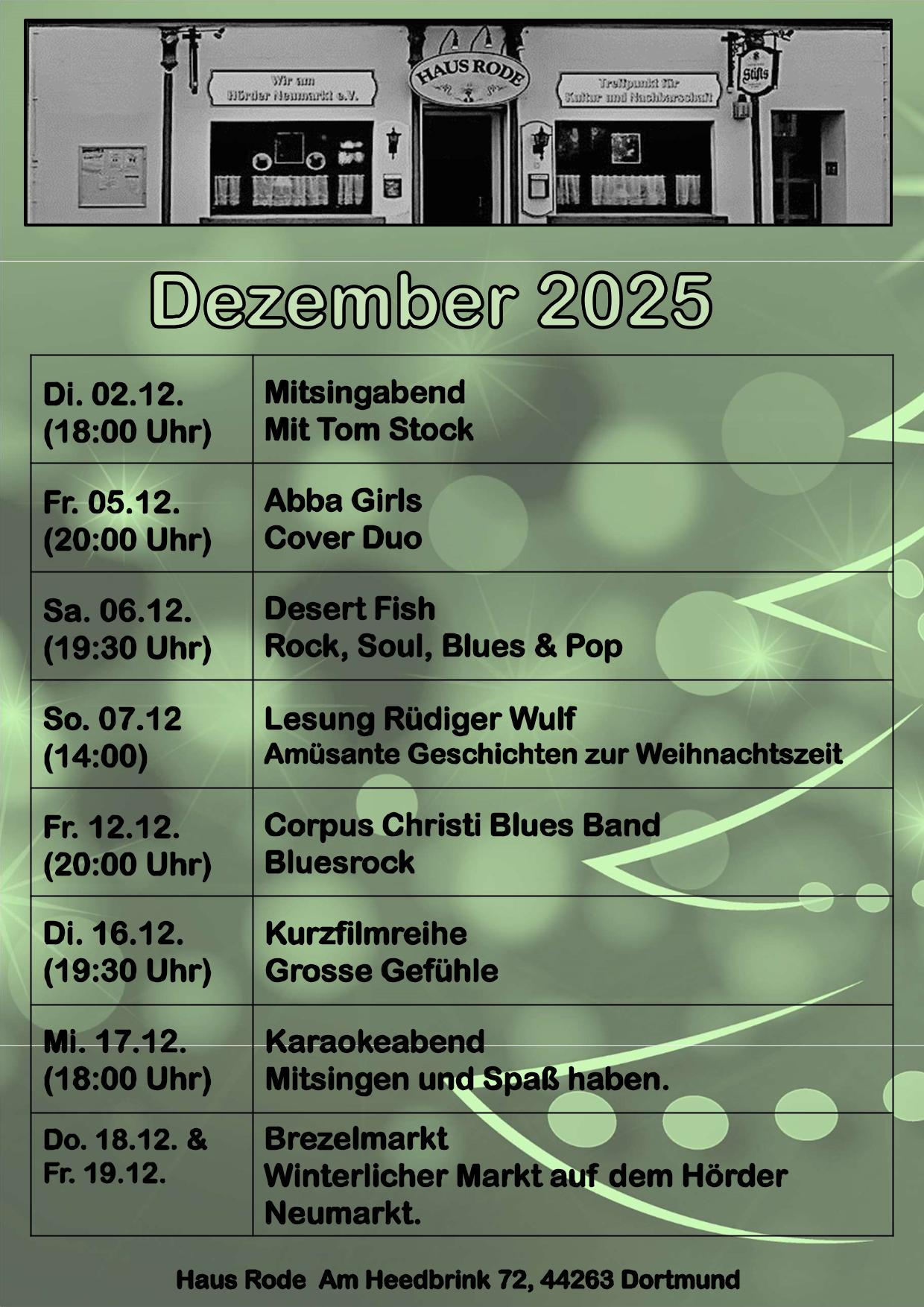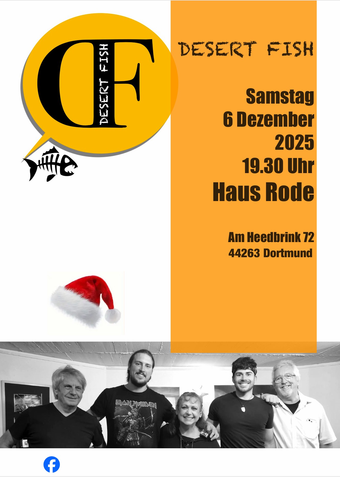 Der Name DESERT FISH steht für fünf versierte Musiker aus Dortmund und Umgebung, vereinzelt mit beeindruckend langjähriger Bühnenerfahrung, die virtuos, kraftvoll und mit Freunde Songs aus Rock, Soul, Blues und Pop spielen. Es sind nicht immer die allgemein bekannten und oft zitierten Number One Hits, sondern Stücke, die jeder sicher schon gehört hat und kennt. Leute seid gespannt. Es wird Euch gefallen.